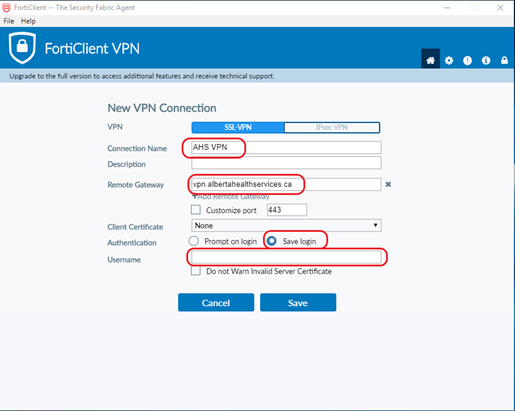 the SSL VPN from inside the AHS network, a Warning message comes up Saying “Unable